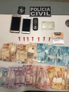 Com o suspeito, foram apreendidos 07 pinos de uma substância similar a “COCAÍNA”. Ademais, também foram apreendidos diversos materiais (bicarbonato de sódio) utilizados comumente para “misturar” com a droga, bem como a quantia de R$ 1.700,00 (um mil e setecentos reais) em dinheiro em espécie, diversos aparelhos celulares e um veículo fox de cor preta.