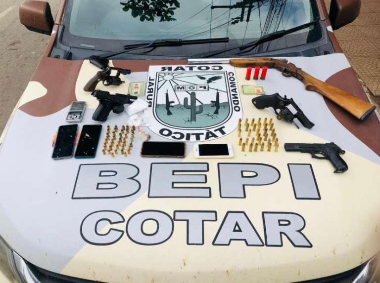 No endereço indicado, Carlos Leandro Mascena Ludovino (20), conhecido como “Bé”; Francisco Eberson Monteiro Moreira (22), Leubruno da Silva Pinheiro (24) e José Diogo Rabelo Nogueira (19) foram localizados. Com eles, uma pistola calibre 380, um revólver calibre 38, uma espingarda cal. 12, um simulacro de pistola, além de 68 munições foram apreendidos.
