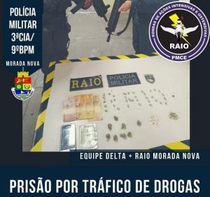 Nas diligências a EQUIPE DELTA avistou um elemento escondendo algo, o elemento tentando não ser visto adentrou no “bar do pita”, na Rua Prefeito Eduardo Girão, Girilandia, momento que foi acompanhado pela composição e capturado, sendo identificado como sendo a pessoa de J. A. F. L. Simultaneamente a equipe RAIO 01 capturou o segundo elemento identificado por T. R. P.