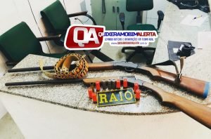 Ao realizarem a abordagem ao indivíduo e fazerem uma busca no interior da residência, os policiais encontraram 02 (duas) espingardas sendo, uma de calibre 12 (doze) sem numeração aparente, 20 (vinte) cartuchos sendo 10 (dez) intactos e dez (10) deflagrados, 01 (uma) calibre 28 (vinte e oito), 03 (três) cartuchos sendo 01 (um) intacto e 02 (dois) deflagrados.
