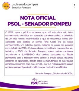 “O Psol vem a público esclarecer que, até esta data, não tinha conhecimento dos fatos em apuração que desencadearam a detenção de um dos nossos recém-filiados e que se encontrava como pré-candidato pelo partido. O senhor Filho Costa era, do nosso conhecimento, um cidadão idôneo, militante da causa das pessoas com deficiência PCD’s. E diante dessa circunstância que envolve seu trabalho, o Psol de Senador Pompeu adota postura cautelosa, anunciando a suspensão dos direitos partidários do filiado”.