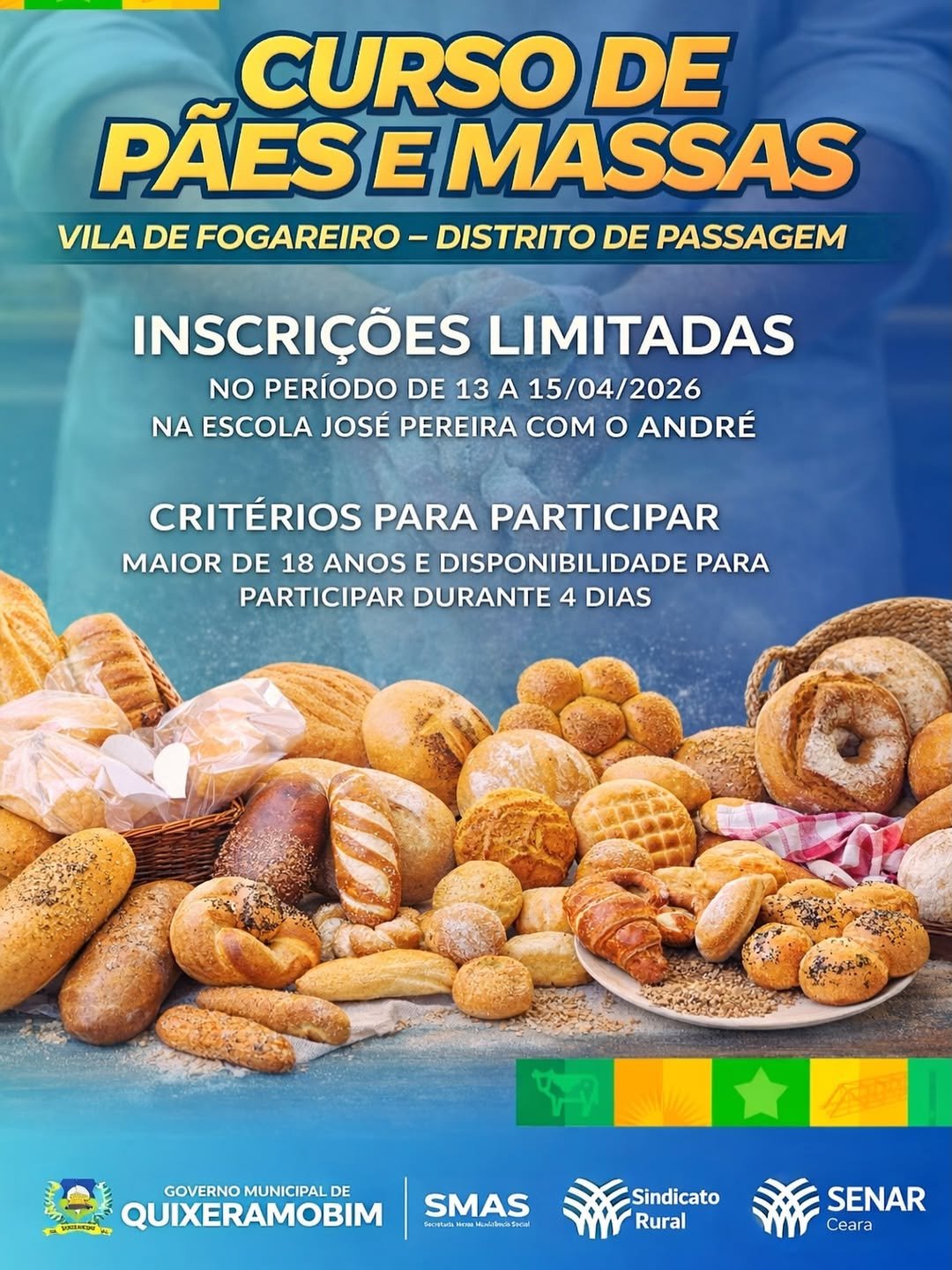 A Prefeitura de Quixeramobim está com inscrições abertas para um curso gratuito de capacitação em produção de pães e massas artesanais. A iniciativa é promovida pela Prefeitura, por meio da Secretaria Municipal de Assistência Social (SMAS), em parceria com o SINRURAL/SENAR.