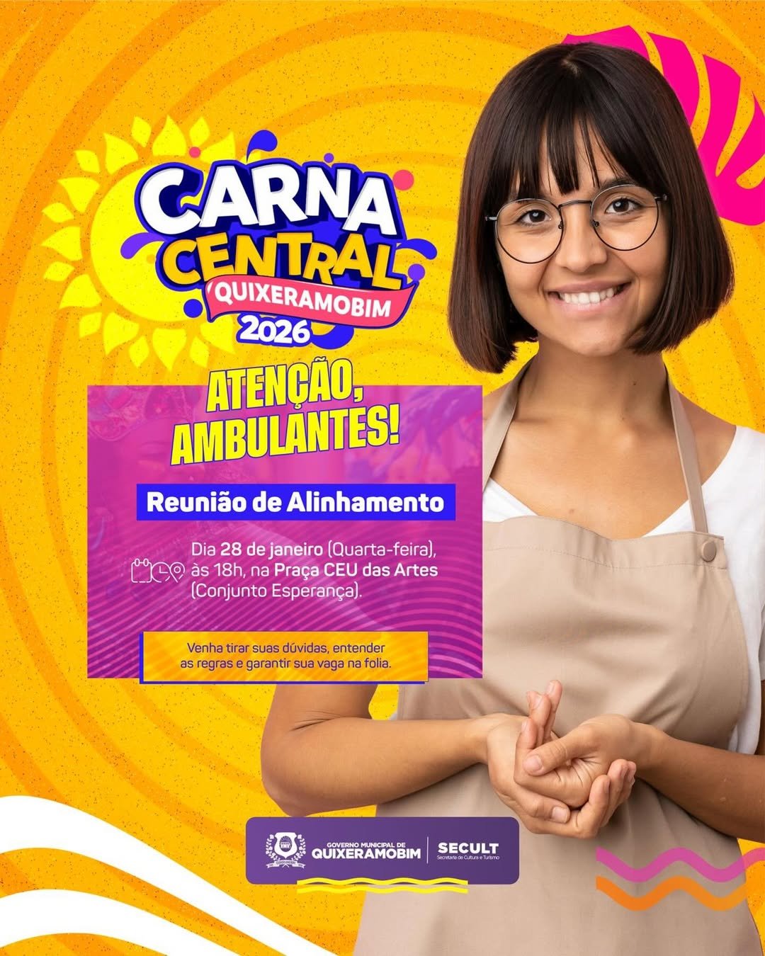 A Prefeitura Municipal de Quixeramobim, por meio da Secretaria de Cultura e Turismo (Secult), está convocando todos os ambulantes interessados em atuar durante o CarnaCentral Quixeramobim 2026 para participarem de uma Reunião de Alinhamento, que acontecerá no próximo dia 28 de janeiro (quarta-feira).