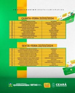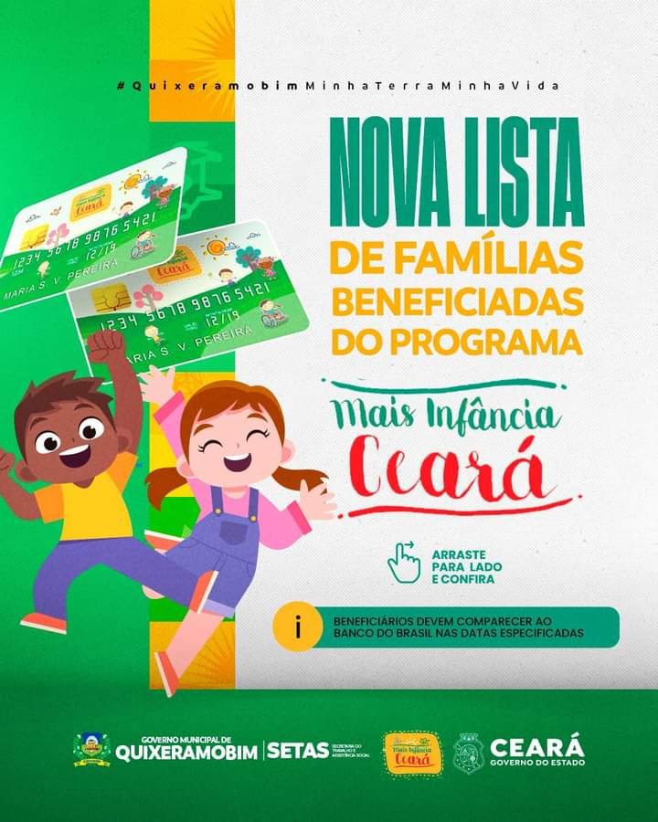 A Prefeitura Municipal de Quixeramobim, através da Secretaria do Trabalho e Assistência Social, está convocando os beneficiários do Programa Cartão Mais Infância Ceará a comparecerem ao Banco do Brasil conforme as datas especificadas para receberem seus cartões e sacarem seus benefícios.