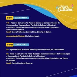 A Semana da Cultura percorrerá a cidade e o interior criando uma conexão cultural afim de como já citado comemorar, resgatar e valorizar o patrimônio cultural imaterial mostrando as