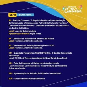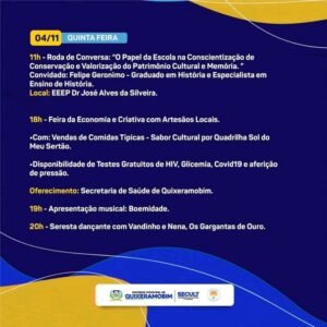 A Prefeitura Municipal de Quixeramobim por meio da Secretaria de Cultura e Turismo irá realizar a primeira Semana da Cultura – de 3 a 5 de Novembro de 2021, com Tema: “A cultura de umpovo é seu maior patrimônio. Preservá-la é resgatar a história.”