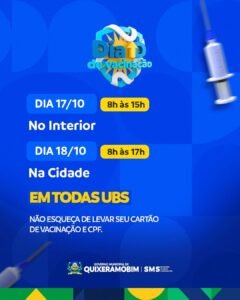 A Prefeitura de Quixeramobim, por meio da Secretaria Municipal de Saúde, promoverá nos dias 17 e 18 de outubro o Dia D de Vacinação, uma grande mobilização para atualizar a caderneta de imunização da população.
