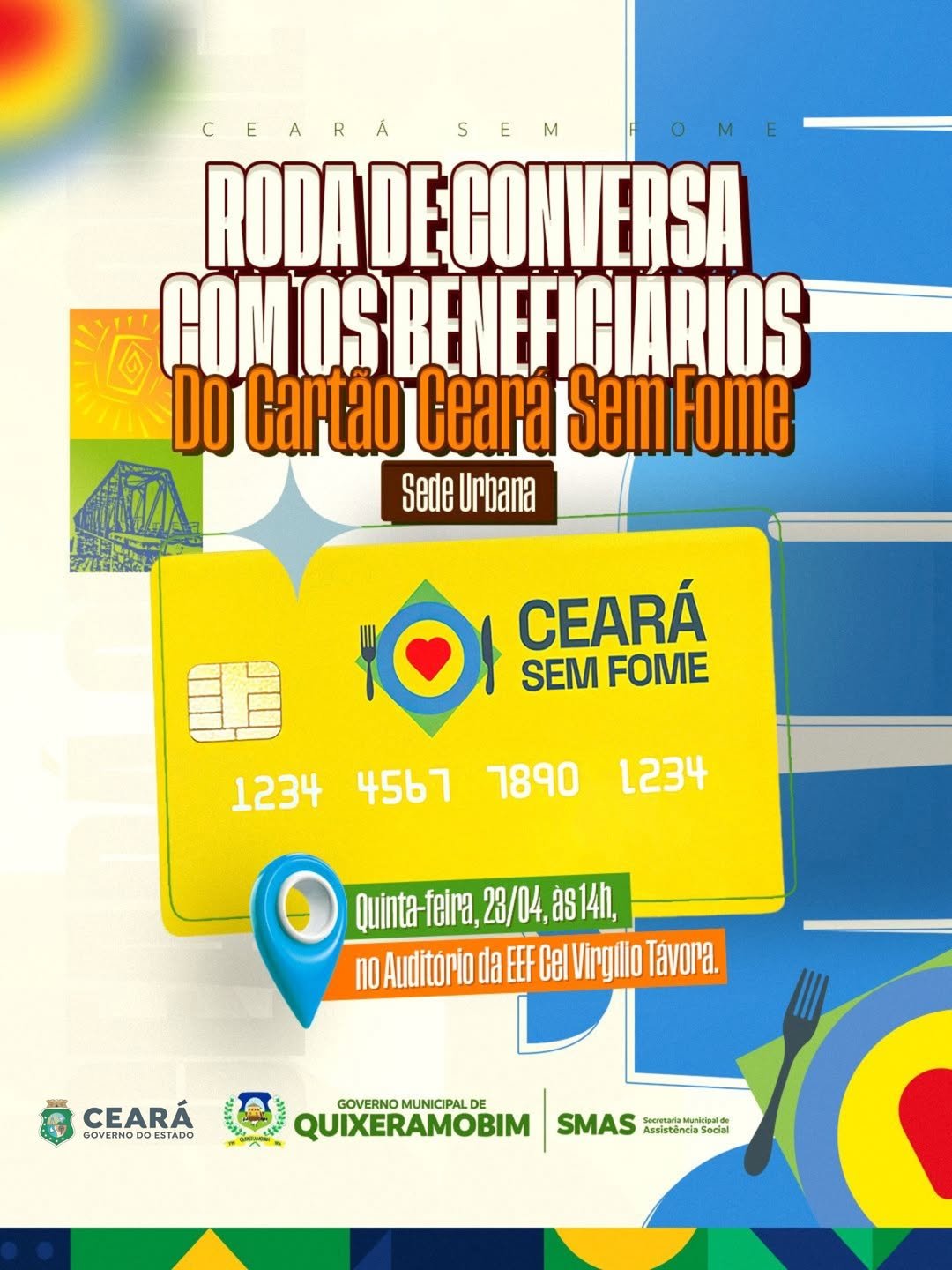 A Prefeitura de Quixeramobim, por meio da Secretaria Municipal de Assistência Social (SMAS), promoverá na próxima quinta-feira, 23 de abril de 2026, uma roda de conversa voltada aos beneficiários do programa Cartão Ceará Sem Fome residentes no município.