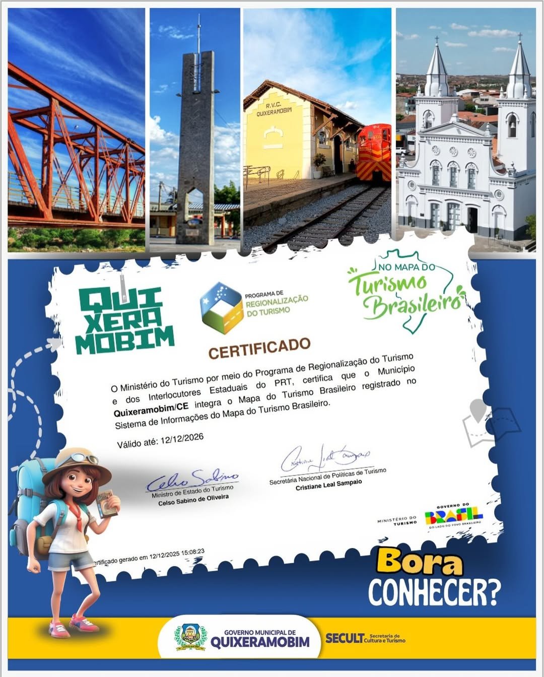A Prefeitura Municipal de Quixeramobim, por meio da Secretaria de Cultura e Turismo (Secult), celebrou uma nova conquista para o município. Quixeramobim foi oficialmente certificado e integrado ao Mapa do Turismo Brasileiro, instrumento do Ministério do Turismo que reconhece cidades com potencial e organização para o desenvolvimento da atividade turística.