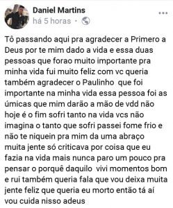 O fato ocorreu na Rua Luciano Coutinho, Bairro Conjunto Esperança, Quixeramobim, o jovem antes de cometer o suicídio fez uma publicação no Facebook, se despedido dos amigos. O corpo do Daniel foi encontrado por familiares.