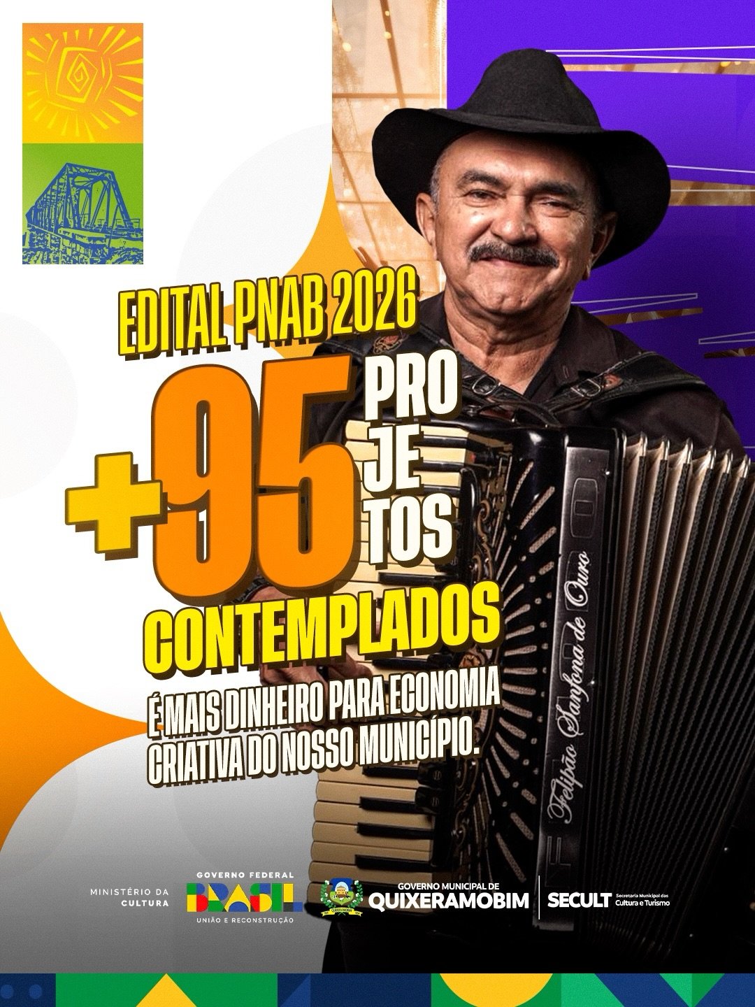 A Secretaria de Cultura e Turismo de Quixeramobim lançou o Edital 02/2026, referente ao Ciclo 2 da Política Nacional Aldir Blanc (PNAB 2026), ampliando o investimento no setor cultural do município. A iniciativa prevê a seleção de mais de 95 projetos, contemplando diversas linguagens artísticas, como música, teatro, audiovisual, artes visuais e manifestações da cultura popular.