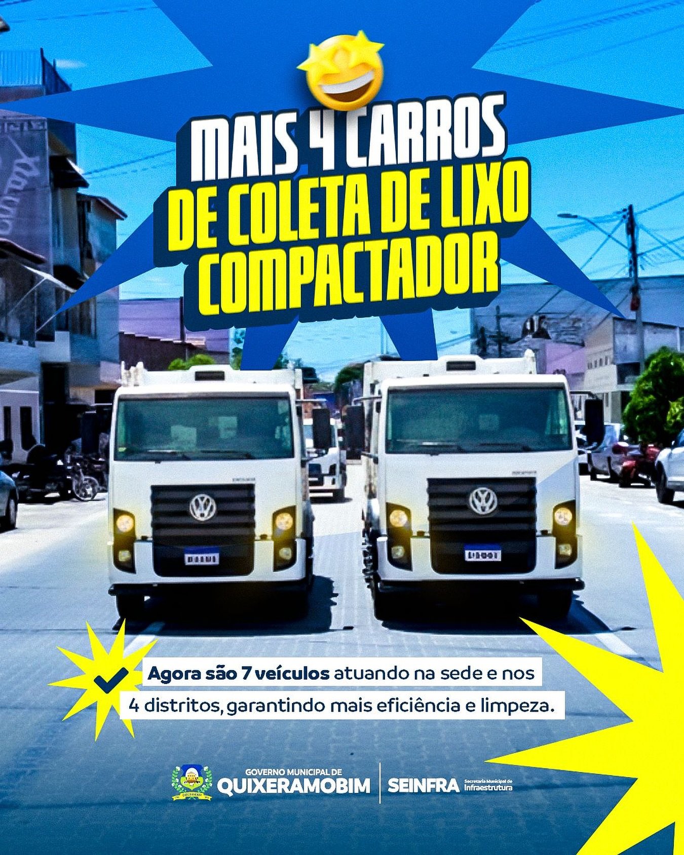 A cidade de Quixeramobim deu mais um passo importante na melhoria da limpeza urbana. O município recebeu quatro novos caminhões compactadores de lixo, que passam a integrar a frota responsável pela coleta de resíduos sólidos.
