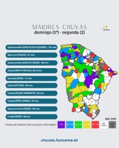 Segundo a Funceme, choveu em 108 dos 158 municípios que informaram dados no período, demonstrando a abrangência das precipitações em diversas regiões do estado.