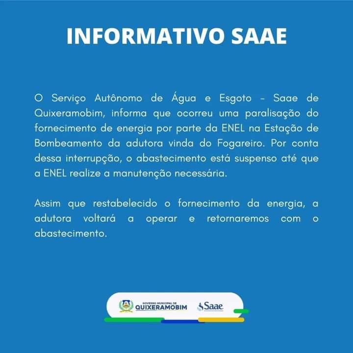 O Serviço Autônomo de Água e Esgoto – Saae de Quixeramobim, informa que ocorreu uma paralisação do fornecimento de energia por parte da ENEL na Estação de Bombeamento da adutora vinda do Fogareiro. Por conta dessa interrupção, o abastecimento está suspenso até que a ENEL realize a manutenção necessária.