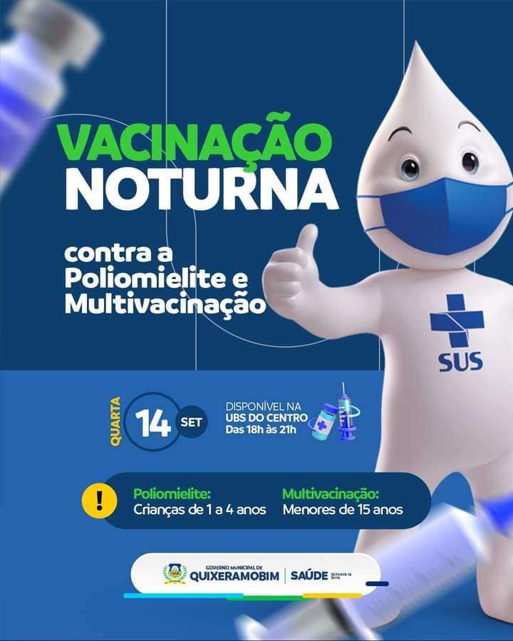 Nesta quarta-feira (14), a Prefeitura de Quixeramobim, por meio da Secretaria da Saúde estará realizando vacinação contra a poliomielite e Multivacinação.