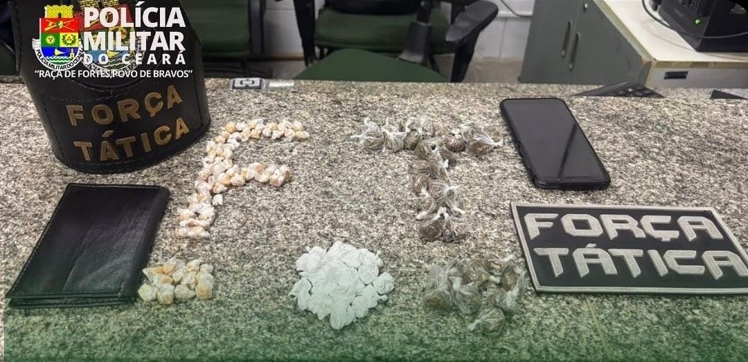 Dentro da pochete, os policiais encontraram 22,5 g de crack, 29,4 g de maconha, 17,4 g de cocaína e R$ 21,00. Segundo a polícia, as drogas estavam fracionadas, o que reforça a suspeita de comercialização. O detido, identificado como A.R.A., 22 anos, já é conhecido pela prática de tráfico na região de Quixadá.