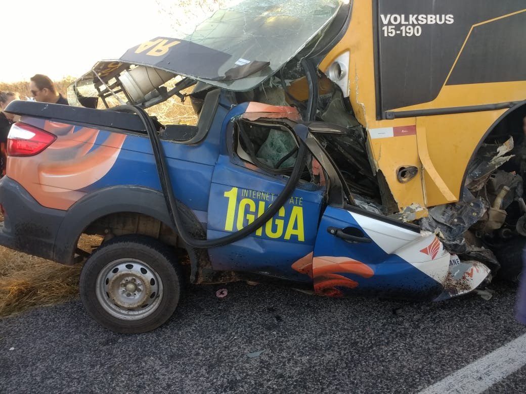 Acidente em Independência: colisão de uma pick-up Strada da empresa Brisanet com um ônibus escolar deixou 2 mortos.