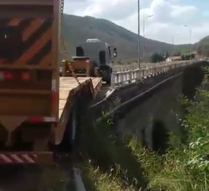 Carreta fica presa na ponte da Barragem de Quixeramobim e interdita trânsito no local.