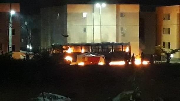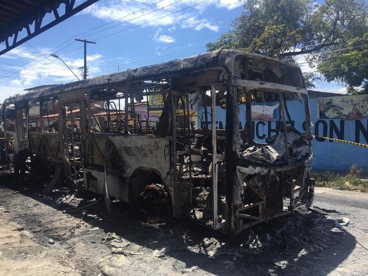 Um ônibus foi incendidado próximo ao Residencial Alameda das Palmeiras, no bairro Ancuri, em Fortaleza, na noite desta segunda-feira, 7. O coletivo era da linha Alameda das Palmeiras (681). Fonte: O Povo Online.