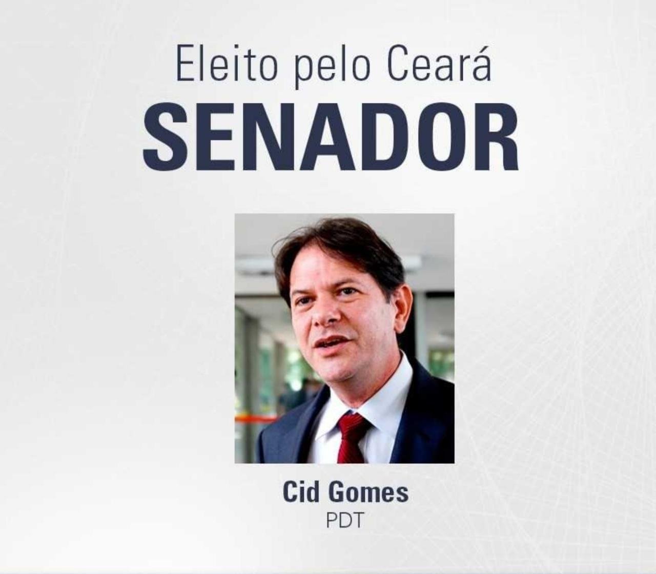 Cid Ferreira Gomes (PDT) foi eleito neste domingo (7) como senador pelo Ceará para os próximos oito anos. Com 79,92% das seções apuradas por volta das 20h, o candidato pedetista tinha 2.516.541 votos, o que correspondia a 40,52% dos votos válidos. A segunda vaga ainda vai ser definida. O Ceará escolhe dois senadores porque o […]