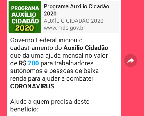 Atenção: é falsa a informação que circula em alguns grupos de WhatsApp e em postagens de redes sociais no domingo (22.03) sobre um suposto cadastramento do Governo Federal em um site para que as pessoas recebam o “Auxílio Cidadão”. O texto cita uma ajuda mensal de R$ 200 para trabalhadores autônomos e pessoas de baixa […]