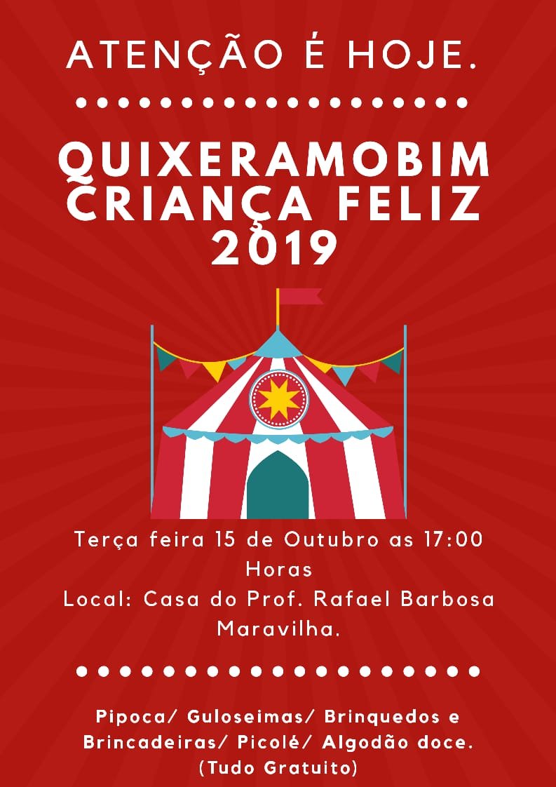 Na tarde desta terça-feira (15) acontece o evento Criança Feliz na cidade de Quixeramobim. O evento é aberto para toda a comunidade e acontecerá na Casa do Prof. Rafael Barbosa, Bairro Maravilha, às 17:00 horas. O evento é totalmente gratuito e toda a população de Quiaxeramobim está convidada para o evento Criança Feliz. Este projeto […]