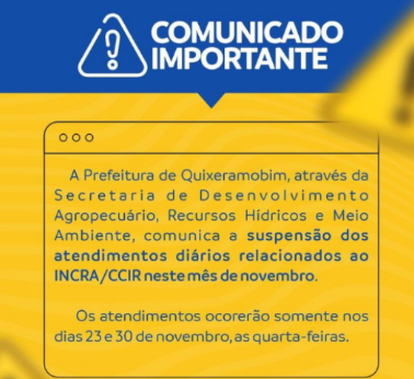 A Secretaria de Desenvolvimento Agropecuário, Recursos Hídricos e Meio Ambiente, informa que em Novembro os atendimentos diários relacionados ao INCRA/ CCIR estão suspensos neste mês de novembro. Nesse mês, os atendimentos ocorrerão somente nos dias 23 e 30, às quarta-feiras.
