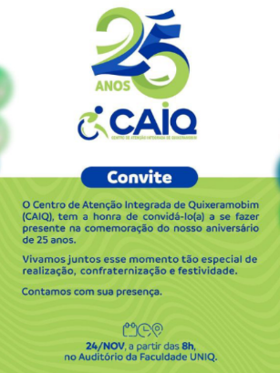 O Centro de Atenção Integrada de Quixeramobim (CAIQ) tem a honra de convidar a todos a participar da comemoração de seu aniversário de 25 ANOS. Vivamos juntos este momento tão especial de realização, confraternização e festividade! Governo Municipal de Quixeramobim, minha terra, minha vida!
