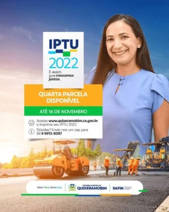 IPTU 2022, é assim que crescemos juntos! A Prefeitura de Quixeramobim, por meio da Secretaria de Finanças, informa a população que a 4ª parcela do IPTU 2022 está disponível até o dia 16 de novembro. Acesse o site www.quixeramobim.ce.gov.br e imprima o seu IPTU 2022 ou, se tiver dúvidas, fale conosco através do WhatsApp (88) […]