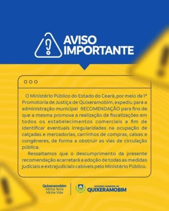 NOTA O Ministério Público do Estado do Ceará, considerando a necessidade de fiscalização em toda zona urbana, recomenda realizar a fiscalização em todos os estabelecimentos comerciais a fim de identificar eventuais irregularidades na ocupação de calçadas e mercadorias, carrinhos de compras, caixas e congêneres. Ressaltamos que o descumprimento da presente recomendação acarretará a adoção de […]