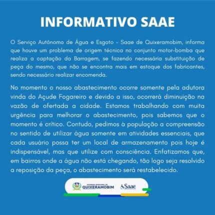 O Serviço Autônomo de Água e Esgoto – Saae de Quixeramobim, informa que houve um problema de origem técnica no conjunto motor-bomba que realiza a captação da Barragem, se fazendo necessária substituição de peça do mesmo, que não se encontra mais em estoque dos fabricantes, sendo necessário realizar encomenda. No momento o nosso abastecimento ocorre […]