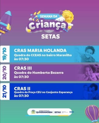 A Prefeitura Municipal de Quixeramobim por meio da Secretaria do Trabalho e Assistência Social (SETAS), realizará nos dias 19, 20 e 21/10/2022 a II Semana da Criança SETAS. A Programação terá início às 8 horas com atividades lúdicas, oficinas de pinturas, pula-pula, brinquedos infláveis, palhaços, castelinho, kidplay e distribuição de pipoca, picolé, lanches além de […]