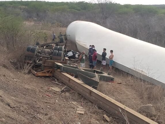 Carreta que transportava pá eólica vira em acidente e motorista morre, em Tauá