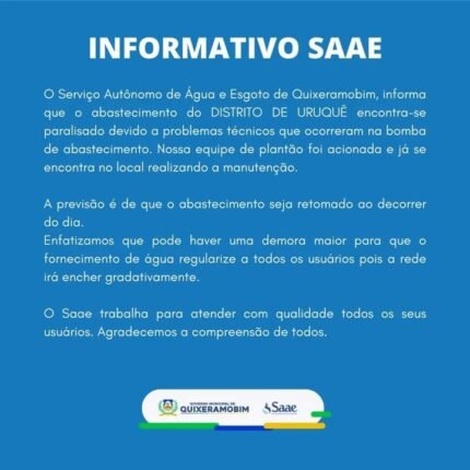O Serviço Autônomo de Água e Esgoto – Saae de Quixeramobim informa que, devido a um rompimento nas tubulações do cano geral da Estação de Tratamento de Água – E.T.A., que alimenta a caixa do São Joaquim, o abastecimento está paralisado. Por ser em uma tubulação dentro da Estação de Tratamento de Água, há uma […]