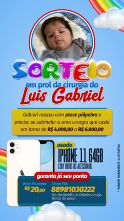 Olá amigos, trago até vocês a história do pequeno Luiz Gabriel, de apenas 4 meses de idade e que precisa da nossa ajuda. Luis Gabriel nasceu com ( Ptose Palpebral Congênita ) no olho esquerdo e precisa fazer sessões de fisioterapia ocular até que ele tenha a idade exata de fazer a cirurgia de correção. […]