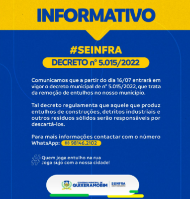 Comunicamos que a partir do dia 16/07 entrará em vigor o decreto municipal de n° 5.015/2022, que trata da remoção de entulhos no nosso município. Tal decreto regulamenta que aquele que produz entulhos de construções, detritos industriais e outros resíduos sólidos serão responsáveis por descartá-los. Para mais informações contactar com o número WhatsApp: 88 98146.2102