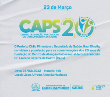 O Centro de Atenção Psicossocial (Caps) comemora, neste mês de março, 20 anos de fundação em nosso município e é com grande alegria que o prefeito, Cirilo Pimenta, e o secretário de saúde, Dr. Raul Dinelly, convidam toda a população a participar das comemorações que acontecerão no próximo dia 23. Confira toda a programação e […]