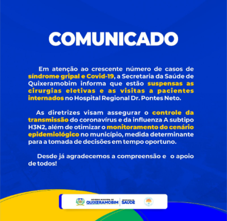 Devido aos aumentos de síndrome gripal e Covid-19, a Secretaria da Saúde de Quixeramobim suspendeu as cirurgias eletivas e as visitas a pacientes internados.