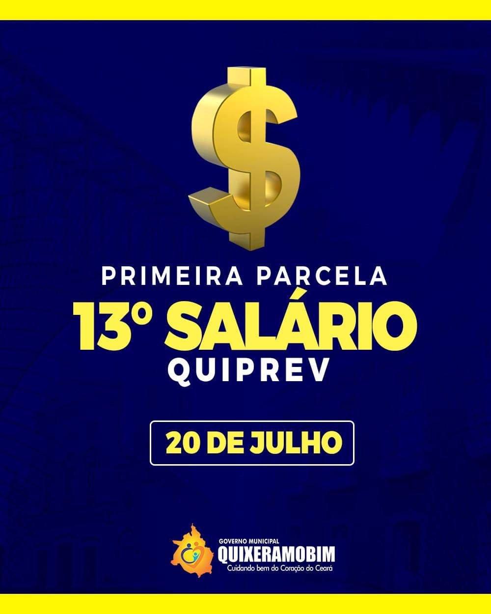A Prefeitura de Quixeramobim informa que amanhã (20), estará disponível o pagamento da primeira parcela do 13º salário do QUIPREV.