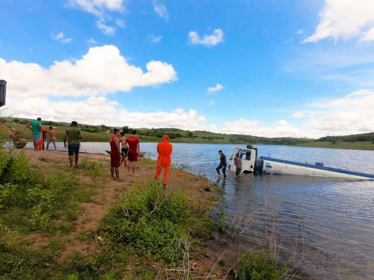 Corpo de Bombeiros resgata caminhão-pipa que ficou preso em açude de Pedra Branca.