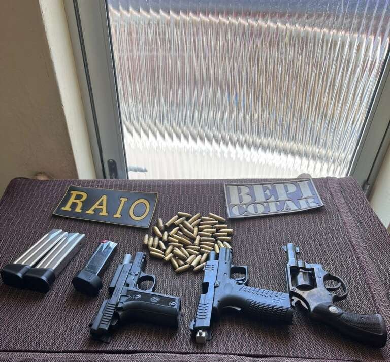 Na residência, foram encontradas três armas de fogo e munições. Um revólver calibre 38 com numeração aparente, pertencente a Valdinei; uma pistola 9mm com numeração suprimida, pertencente a Cláudio; e uma pistola .40 com numeração aparente, pertencente a lago. Na residência, também foram apreendidos 39 cartuchos de calibre 9mm intactos, 11 cartuchos de calibre .40, seis cartuchos calibre 38, além de uma motocicleta e aparelhos celulares. Os suspeitos foram conduzidos à Delegacia Regional de Crateús, onde foram autuados em flagrante por posse ilegal de arma de fogo e por associação criminosa.
