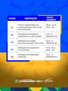 A Universidade Estadual do Ceará (UECE) divulgou o cronograma oficial para as matrículas dos candidatos aprovados no Vestibular Especial EaD 2026.1. O processo de matrícula terá início no dia 8 de dezembro de 2025, com o envio do requerimento de matrícula através do sistema SIGMA EaD.