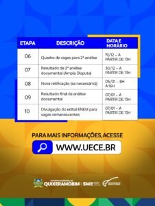 Vagas remanescentes: A UECE também divulgará as vagas remanescentes, bem como o edital para os candidatos que optaram pela utilização da nota do ENEM.