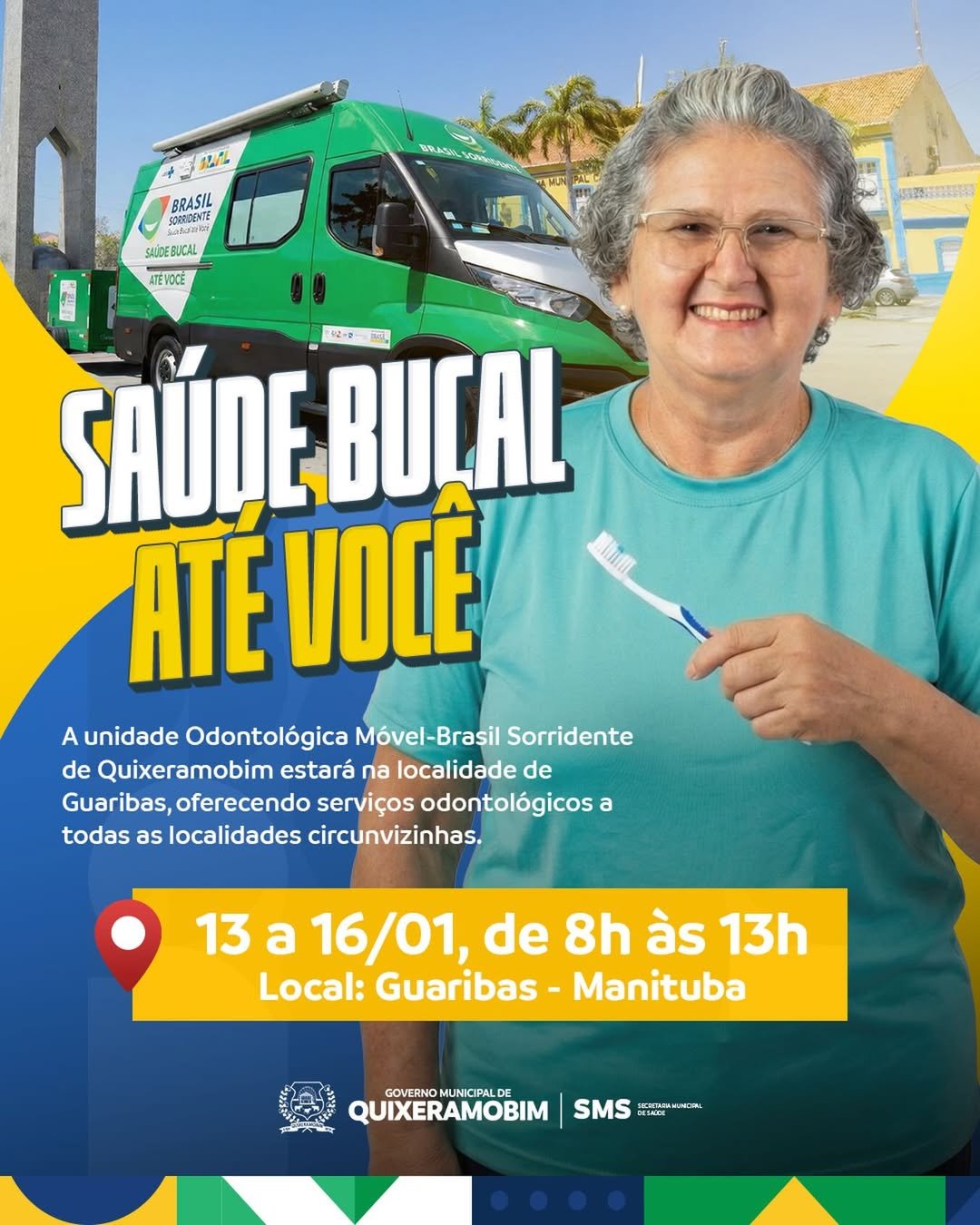 A Unidade Odontológica Móvel Brasil Sorridente estará em Guaribas – Manituba, levando atendimento odontológico gratuito à população local e comunidades vizinhas. A ação acontece entre os dias 13 e 16 de janeiro, no horário das 8h às 13h, com o objetivo de aproximar os serviços de saúde bucal da população.