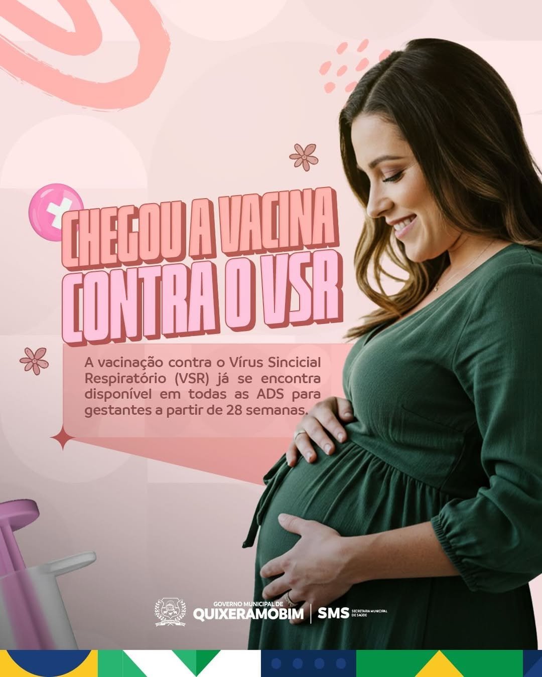 A Secretaria da Saúde de Quixeramobim informou que a vacinação contra o Vírus Sincicial Respiratório (VSR) já está disponível para gestantes a partir de 28 semanas de gestação. As doses da vacina podem ser acessadas nas Unidades Básicas de Saúde (ADS) do município, que já receberam o primeiro lote da vacina.