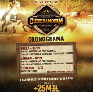 A abertura do evento vai acontecer nesta quinta-feira, 08, com uma cavalgada pela cidade de Quixeramobim. A concentração vai começar a partir das 16h saindo da Fábrica dos Carneiros e finalizando no Posto Santo Antônio. Durante a cavalgada vai acontecer um sorteio no valor de R$ 200,00 para os participantes.