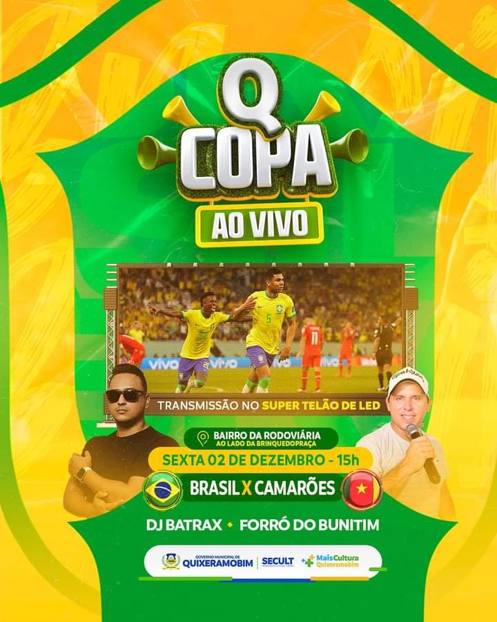 A Prefeitura de Quixeramobim, por meio da Secretaria de Cultura e Turismo, está preparando um super espaço para toda a população ver o show de gols que a nossa seleção brasileira dará.
